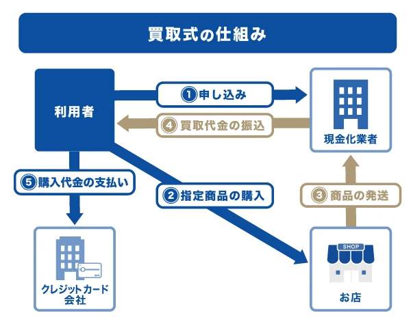 買取式とは、クレジットカードを使って換金性の高い商品を購入し、それを中古買取店や金券ショップに持ち込んで現金化する仕組みです。
