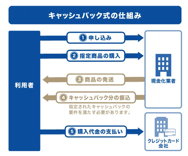 キャッシュバック式は、現金化業者が販売する「価値のほとんどない商品(100均レベルの雑貨やデジタル画像など)」をクレジットカードで高額購入し、その購入特典として現金を受け取る仕組みです。